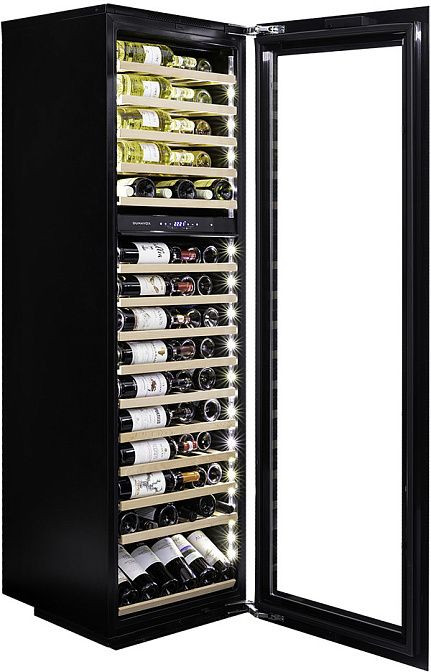 Одной из особенностей этого холодильника является его емкость. Общий объем составляет 288 литров, что позволяет хранить до 114 бутылок вина. Внутреннее освещение и 15 деревянных полок делают его не только вместительным, но и удобным в использовании. Также есть возможность перенавешивания двери и регулировка ножек, что позволяет легко адаптировать холодильник под любые условия.