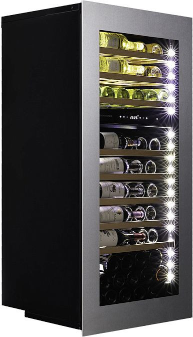 Стильный черный цвет корпуса, прозрачная дверь и скрытые ручки делают дизайн этого холодильника современным и элегантным. Дверь выполнена из стекла с защитой от УФ-лучей, что предотвращает порчу вина под воздействием солнечного света. Дверной упор расположен справа, но есть возможность перенавешивания двери для удобства использования.