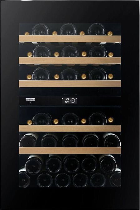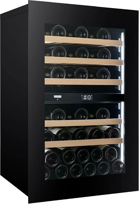 Дизайн холодильника выполнен в черном цвете, что придает ему современный и элегантный вид. Прозрачная дверь, выполненная в стальной рамке, позволяет в любой момент увидеть, какие вина хранятся внутри. Полки из дерева не только добавляют эстетику внешнему виду, но и обеспечивают надежное хранение бутылок.