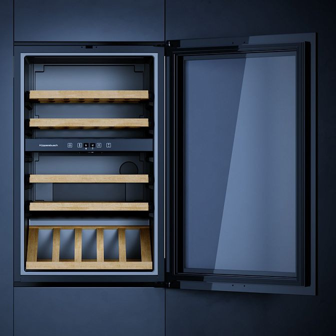 Элегантный встроенный винный шкаф выполнен в глубокoм черном оттенке с фронтальной стеклянной дверью в тонкой рамке, которая демонстрирует коллекцию и защищает бутылки от внешних воздействий. Металлические боковые стенки и аккуратные металлические ручки подчёркивают сдержанный современный характер корпуса, а древесные выдвижные полки коричневого цвета добавляют тепла и фактурности интерьеру. Интегрированная вертикальная ручка и функция открытия нажатием обеспечивают минималистичный вид фасада; стеклянная панель сохраняет аккуратность, а встроенная подсветка LED равномерно выделяет содержимое без нагрева.