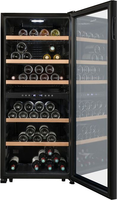 Особенностью этого винного холодильника является его двухтемпературный режим. Это означает, что вы можете установить разные температуры в верхней и нижней зоне холодильника, что идеально подходит для хранения разных типов вина. Верхняя зона имеет диапазон температур от +5 до +12 градусов, а нижняя — от +12 до +18 градусов. Система управления температурой сенсорная и расположена на корпусе холодильника для удобства использования.