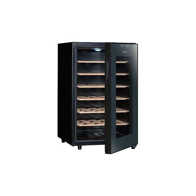 Стеклянная дверь обеспечивает возможность всегда видеть, какие бутылки находятся внутри, не открывая холодильник. Благодаря защите от УФ-лучей, вино сохраняет свои вкусовые качества. Дверь открывается вправо, что обеспечивает удобство пользования в зависимости от расстановки мебели.