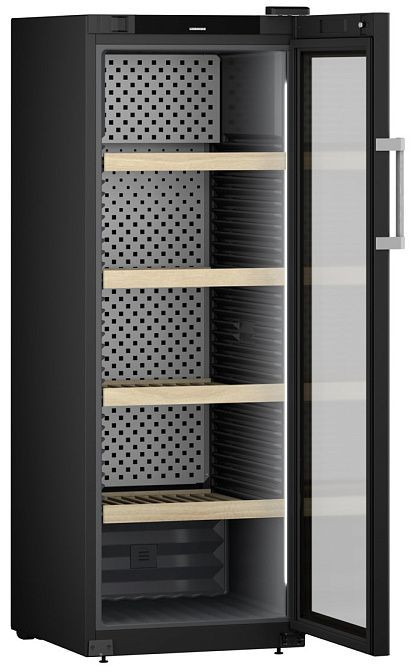 Элегантный аппарат выполнен в черном цвете с выразительной стеклянной дверью, которая делает фронт прозрачным и презентабельным. Металлические боковые стенки подчеркивают строгие геометрические формы корпуса, а серебристые ручки из металла добавляют ощущение премиальности и практичности. Стеклянная створка позволяет демонстрировать коллекцию, не нарушая микроклимат, при этом механизм открывания направлен вправо, обеспечивая удобство размещения в интерьере. Высота 168,4 см, ширина 59,7 см и глубина 76,3 см позволяют устойчиво разместить прибор отдельно стоящим устройством, сохранив достаточный внутренний запас для плотной укладки бутылок.