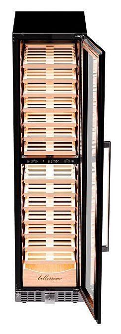 Элегантный аппарат сочетает сдержанный профиль и премиальные материалы: корпус выполнен из металла в оттенке нержавеющей стали, фронтальная дверь — стеклянная с двойным остеклением и защитой от УФ-лучей, а ручки из металла серебристого цвета подчеркивают общий минималистичный образ. Панорамное окно демонстрационного типа позволяет эффектно представить коллекцию, обеспечивая при этом стабильный микроклимат внутри благодаря встроенному вентилятору для равномерного распределения температуры. Бежевые выдвижные полки из дерева обеспечивают мягкий контраст с холодным металлом и аккуратно фиксируют бутылки в наклонных нишах, при этом набор полок позволяет разместить до 39 единиц, сохраняя удобный доступ к каждой позиции. Дверь может открываться вправо и при необходимости перевешиваться, что повышает гибкость встроенной установки, а небольшой размер по глубине и ширине делает модель пригодной для встраивания в нишу 830x600x595 мм или размещения отдельно.