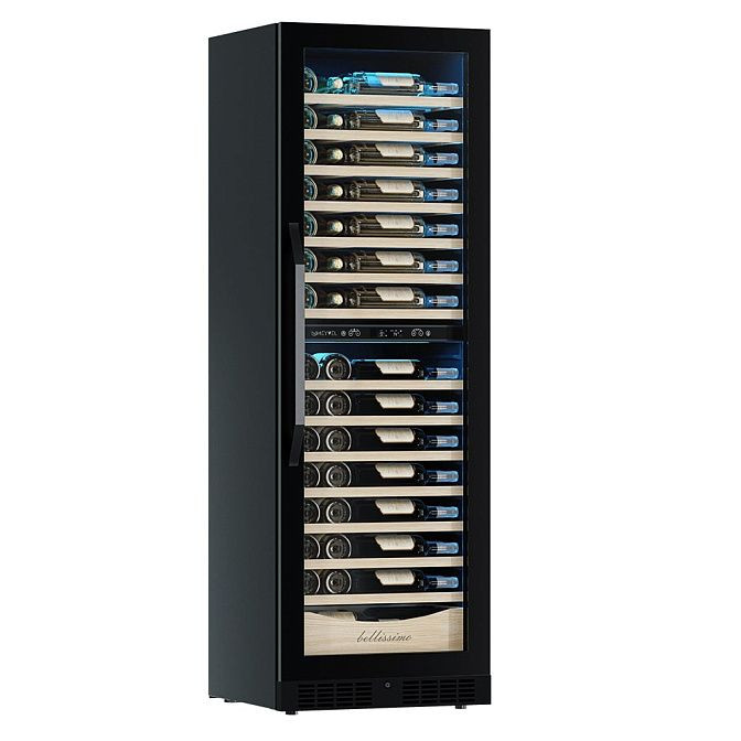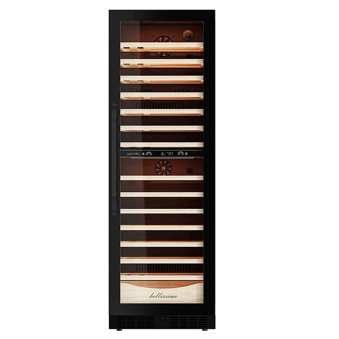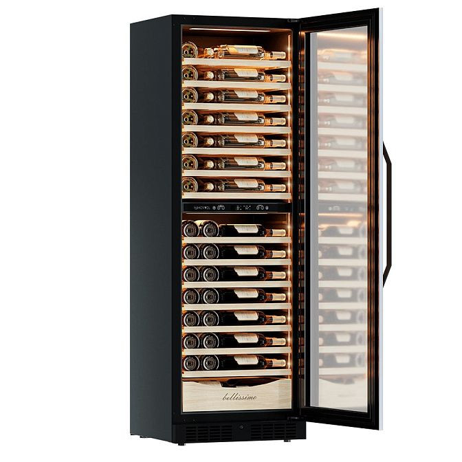 Внутри холодильника находятся 14 выдвижных полок из дерева, на которых удобно размещать бутылки. Они оснащены доводчиками для бережного хранения вина. Кроме того, внутри есть контейнер для воды и угольный фильтр, который помогает поддерживать оптимальную влажность.