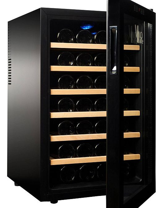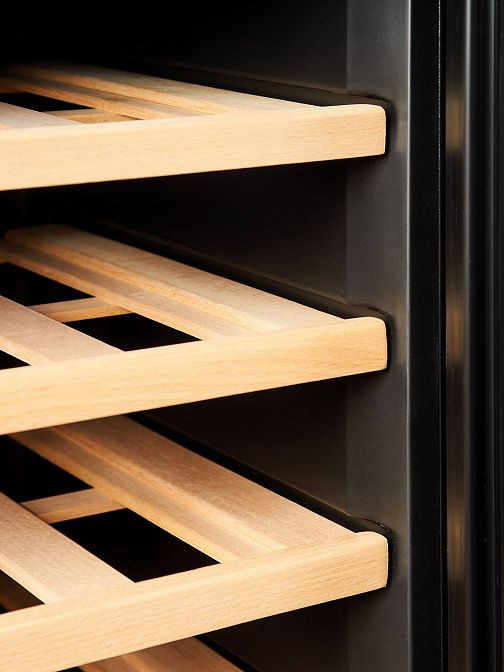 Дизайн холодильника выполнен в строгом черном цвете, что делает его универсальным решением для любого интерьера. Прозрачная дверь из стекла и стали позволяет в любой момент увидеть содержимое холодильника, а также служит дополнительным декоративным элементом. Полки из металла и дерева являются не только удобными для хранения бутылок, но и добавляют элегантности общему виду устройства.