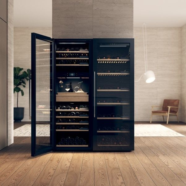 Элегантный и функциональный прибор сочетает премиальную эстетику Pure с продуманной эргономикой для хранения и демонстрации коллекции бутылок. Передняя панель выполнена из металла с прозрачной дверью в стальной рамке, а боковые стенки — из окрашенной стали, что гарантирует долговечность и аккуратный внешний вид в любом интерьере. Прозрачное стекло с защитой от ультрафиолета сохраняет органолептические свойства напитков, минимизируя влияние света, а внутренняя RGB-подсветка обеспечивает мягкое акцентое освещение с возможностью плавной регулировки яркости. Черная отделка полок и элементов создает контрастную, стильную композицию, пригодную для встраивания под столешницу или установки отдельно благодаря жесткому креплению двери и возможности перенавешивания створки вправо.