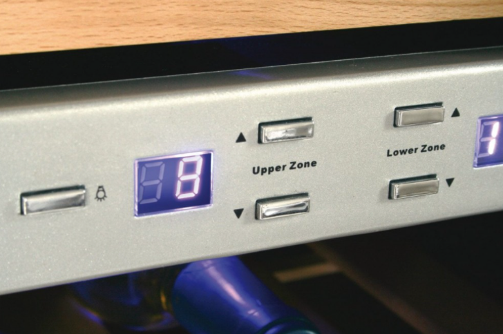 Особенность аппарата — двухтемпературный режим, реализованный в двух зонах с независимыми настройками, каждая из которых позволяет устанавливать температуру в диапазоне от +5 до +20 °C. Это дает возможность одновременно хранить разные стили вина при оптимальных параметрах: например, поддерживать оптимальную прохладу для белых и шампанских напитков и более высокую температуру для красных, не нарушая ароматический баланс. Сенсорная панель управления расположена внутри, оснащена дисплеем и индикаторами температуры и состояния включения, что делает регулировку точной и наглядной, а также предотвращает случайные изменения благодаря защите от детей.
