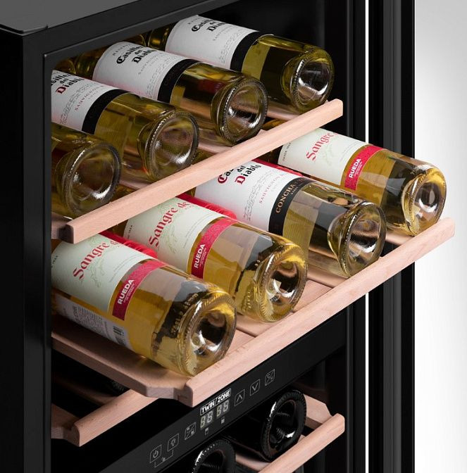 Изящный корпус в черном цвете и современная эстетика придают этому прибору статусный внешний вид, гармонично вписывающийся в интерьер кухни или зоны хранения напитков. Корпус выполнен из нержавеющей стали, фронтальная панель из стекла, а дверца — в стеклянной раме со стеклопакетом, что обеспечивает визуальную привлекательность и дополнительную термоизоляцию. Продуманная геометрия и прямоугольная форма корпуса при компактных габаритах 858x480x618 мм позволяют установить изделие отдельно или в нишу с размерами 45x56-58x56 см, сохраняя аккуратность линий и мягкую интеграцию в общую мебельную композицию.