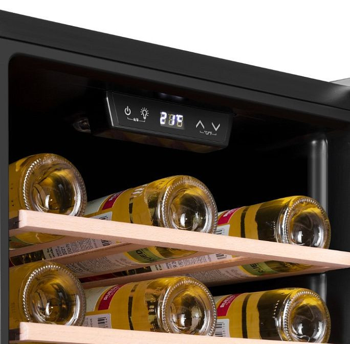 - Продуманная внутренняя компоновка на 56 бутылок с пятью выдвижными полками из бука для удобства размещения и извлечения.
