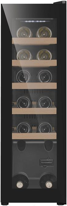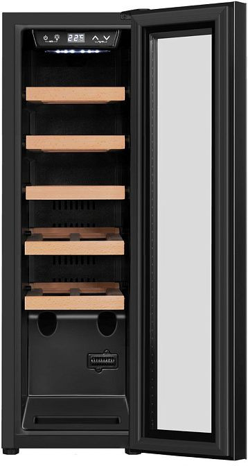 Шкаф имеет вместительность в 45 литров, что позволяет разместить до 12 бутылок вина. Пять съемных и выдвижных полок из бука обеспечивают удобное размещение бутылок. Благодаря двум температурным режимам и независимой регулировке температуры в камерах, можно хранить разные сорта вина при оптимальных для них условиях. Диапазон установки температуры варьируется от +5 до +22 градусов Цельсия.