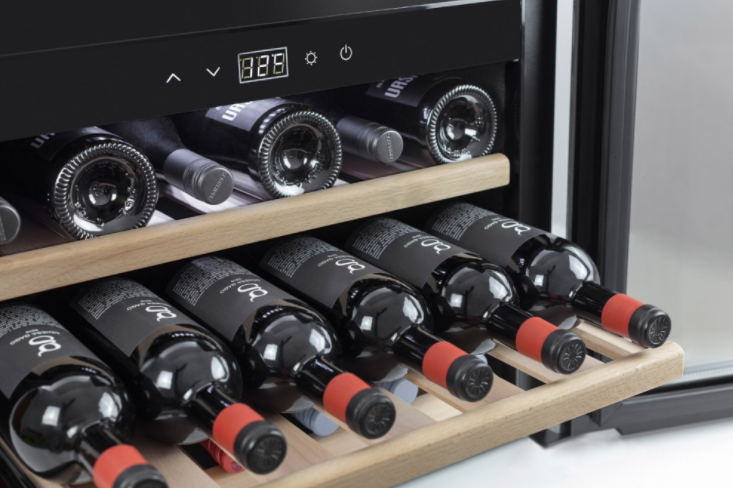 - Три выдвижные деревянные полки и мягкая LED-подсветка позволяют удобно хранить и демонстрировать до 18 бутылок при компактных габаритах.