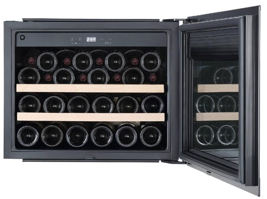 Элегантный встраиваемый прибор выполнен в стиле Black Velvet с фронтальной панелью из нержавеющей стали и матовыми черными ручками, что делает его выразительным акцентом современной кухни или домашнего бара. Прозрачная стеклянная дверь с защитой от ультрафиолетового излучения не только демонстрирует коллекцию, но и оберегает напитки от вредного света, сохраняя аромат и структуру напитков. Компактные габариты 45,5x59x56,3 см и возможность встраивания в нишу (450—465x560—568x550—560 мм) позволяют органично разместить шкаф в мебельном гарнитуре, не теряя полезного пространства.