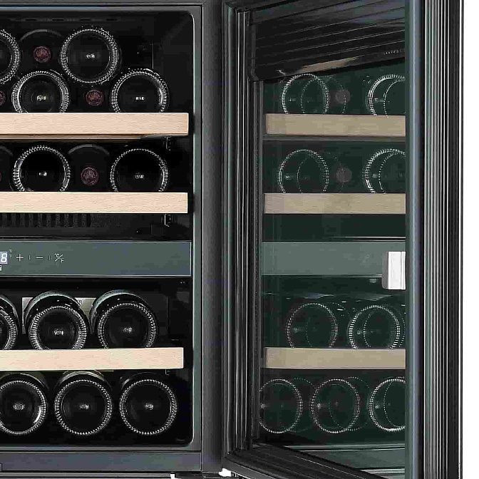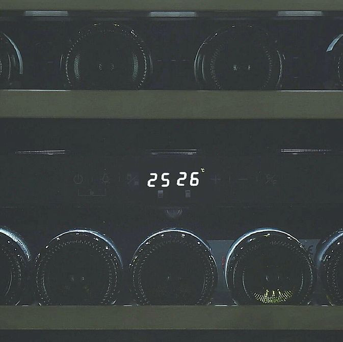 Внутри установлены деревянные выдвижные полки коричневого оттенка, обеспечивающие бережное хранение бутылок и аккуратную презентацию; предусмотрен контейнер для воды и встроенный вентилятор для равномерного распределения холода по отсеку. Двойная система охлаждения с инверторным компрессором на R600A гарантирует стабильные условия в каждой из двух зон, а независимая регулировка позволяет задать разные режимы в верхней и нижней части: диапазон установки от +5 до +18 °C в каждой зоне. Сенсорное управление Smart Touch и дисплей, расположенный внутри камеры, обеспечивают точную настройку и интуитивное управление, а память аварийной температуры и оптическо-акустическая сигнализация моментально оповестят о неполадках.