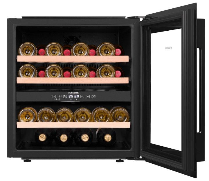 Элегантный корпус в черном цвете и современный образ этого встраиваемого прибора объединяют практичность и аккуратную эстетику для современной кухни. Корпус выполнен из нержавеющей стали, фронтальная панель — стекло, дверь в стеклянной раме со стеклопакетом гарантирует хорошую тепло- и звукоизоляцию, а механизм плавного закрывания делает эксплуатацию комфортной и долговечной. При габаритах 595x590x563 мм и глубине ниши для встраивания 45x56-58x56 см устройство занимает минимум места, при этом полезный объем камеры составляет 41 литр, что позволяет разместить несколько комплектов посуды или бутылок в зависимости от задач.