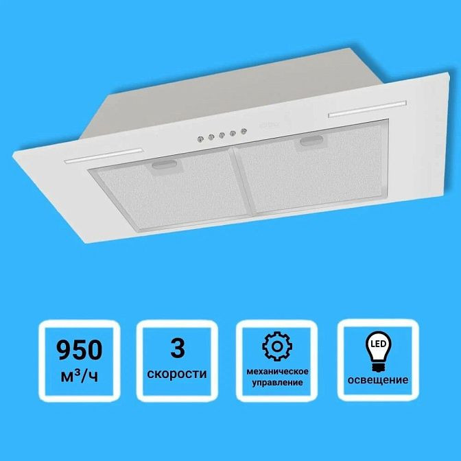 Элегантный корпус из металла и лаконичный белый тон с контрастным декоративным коробом черного цвета формируют современный облик встраиваемого решения для кухни. Узкая панель глубиной 28 см и шириной 79,5 см позволяет органично размещать прибор в шкафу над варочной поверхностью, не загромождая пространство, а выдвижная секция расширяет захват воздуха при интенсивной готовке. Конструкция рассчитана на встраивание с габаритами ниши 33x49.2x26 см и обеспечивает высоту с возможностью регулировки до 85,5 см, что упрощает интеграцию в разные кухонные композиции. Металлический корпус и алюминиевые кассеты-жиропоглотители гарантируют надежность и простоту обслуживания: два моющихся фильтра легко извлекаются для очистки, а индикатор загрязнения подскажет время обслуживания. Периметрическая система всасывания повышает эффективность улавливания паров и запахов, направляя поток к центральному каналу диаметром 150 мм и обеспечивая максимальную производительность до 950 куб.м/ч в отводном режиме. Для помещений до 35 кв.м доступен рациональный баланс между мощностью и уровнем шума: три рабочих ступени позволяют выбрать экономичный режим на 150 м3/ч, среднюю скорость 240 м3/ч или интенсивный режим 385 м3/ч, при котором достигается повышенная производительность; максимальная производительность рециркуляции — 350 м3/ч. Панель управления размещена сбоку и реализована в виде удобных кнопок — механическое решение обеспечивает надежность и простоту эксплуатации без дистанционного пульта. Освещение рабочей зоны организовано двумя светодиодными лампами по 5 Вт каждая, создающими ровный свет для удобной готовки. Мотор мощностью 224 Вт в связке с подключаемой мощностью 272,6 Вт обеспечивает уверенную силу всасывания, а антивозвратный клапан предотвращает обратную тягу при выключенном агрегате. При необходимости прибор легко перевести в режим рециркуляции: приём угольных модулей KIT 0277 (приобретаются отдельно) позволяет удалять запахи без вывода в вентиляцию. Конструктивно предусмотрены все базовые элементы для комфортной установки: длина кабеля 1,5 м, стандартное напряжение 220-240 В и рекомендуемая минимальная высота над электроплитой 65 см и над газовой — 75 см. Вместительный комплект поставки включает устройство, два жироулавливающих модуля, вилку питания и документацию; срок гарантийной поддержки — 24 месяца. Класс энергопотребления C и функция Clean Air дополняют практический набор возможностей, делая прибор функциональным и экономичным в повседневном использовании.