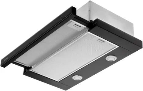 Современный дизайн этой подвесной модели гармонично сочетает матовый метал и закаленное стекло черного цвета, что делает прибор стильным акцентом любой кухни. Минималистичная передняя панель плавно выдвигается, образуя удобный козырек для эффективного захвата паров, а декоративный короб также выполнен в черном оттенке, что обеспечивает аккуратный вид при встраивании в навесной шкаф. Узкий профиль (высота 17,2 см, ширина 60 см) позволяет встроить устройство даже в ограниченное пространство; глубина регулируется в диапазоне 32-42,2 см, а размеры ниши для встраивания составляют 33x49,2x26 см, что облегчает монтаж в шкаф или подвесной каркас. Конструкция предусматривает антивозвратный клапан, предотвращающий проникновение запахов из вентиляции обратно в помещение.