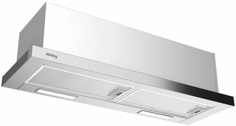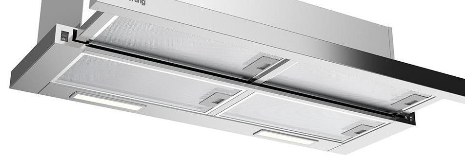 Управление выполнено механическим методом со слайдерными ползунками, расположенными сбоку для удобного доступа при встроенном размещении; дистанционный пульт не предусмотрен, индикаторы выбранной мощности и режима отсутствуют, но реализован индикатор загрязнения фильтра, сигнализирующий о необходимости обслуживания. В корпусе предусмотрен антивозвратный клапан, который препятствует обратному току воздуха, а выдвижной козырек увеличивает площадь захвата и снижает риск распространения испарений.