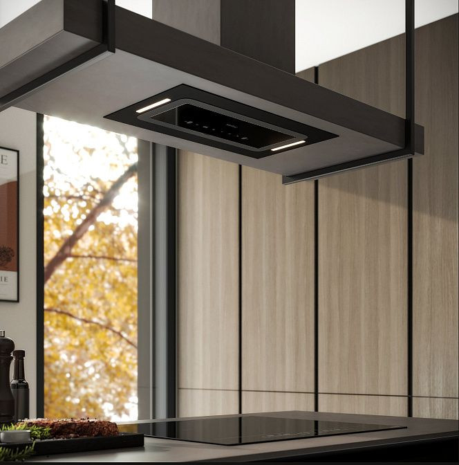 создана для современных кухонь, где важны аккуратный внешний вид и высокая эффективность очистки воздуха. Подвесной формат и комбинированное исполнение из металла и стекла подчеркивают легкость конструкции, при этом прибор выглядит монолитно и солидно. Черная лицевая панель с гладкой поверхностью визуально «растворяется» в пространстве, а тонкая окантовка теплого бежевого оттенка делает композицию мягче и позволяет вписать устройство как в светлые, так и в более темные интерьеры. Лаконичная геометрия без лишнего декора поддерживает минималистичный стиль и не перегружает зону над варочной поверхностью.