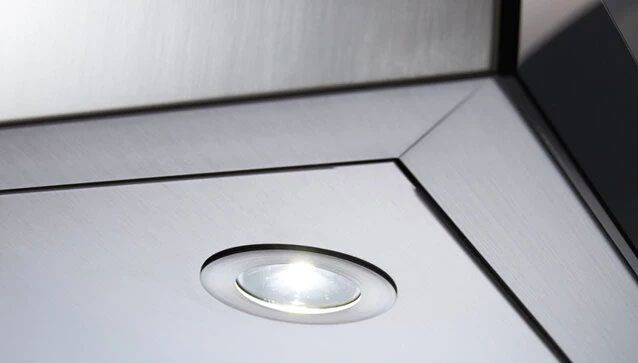Эта модель сочетает строгий минимализм и продуманную эргономику: передняя панель выполнена из черного стекла, а окантовка и видимые элементы — из нержавеющей стали, что придает изделию современный характер и легко впишется в интерьеры с акцентом на металл и темные тона. Наклонная настенная конструкция экономит пространство над рабочей зоной и формирует визуально легкий профиль, при этом корпус изготовлен из металла повышенной износостойкости. Подсветка реализована светодиодной лампой с цветовой температурой 4000-4500 К, обеспечивающей естественную цветопередачу поверхности кухонной плиты и комфортную видимость в процессе готовки.